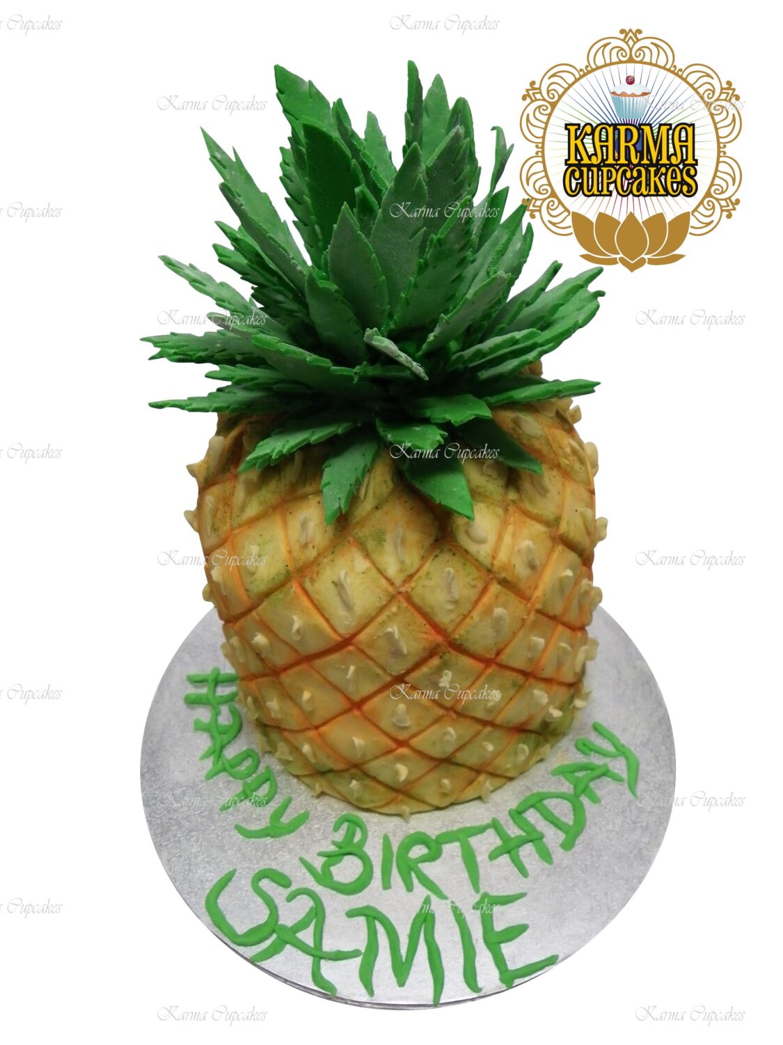 Fondant Iced 3D Pineapple Cake in chocolate or vanilla flavour on a Silver Masonite Board and optional Birthday Greeting. Serves 24-30 cafe size slices