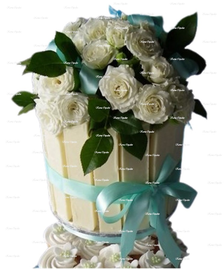 6″ cake with shards of white chocolate. An ideal cake for going on top of a cupcake tower. Does not include flowers as you may like to add your own or we can offer a simple mixed arrangement for $55 extra (flowers will be mixed for $55 and may not be like the roses in the picture)