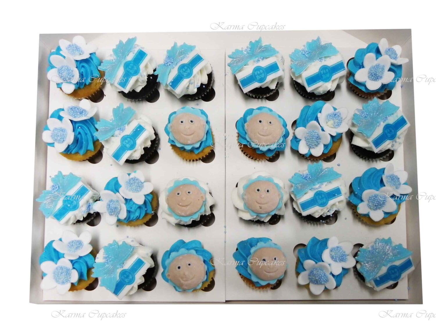 Our Chocolate and Vanilla Baby Gender Surprise Cupcakes are topped with classic swirl of buttercream icing. On our cupcakes are teddy bears, flowers, butterflies, baby faces and nappies. Also “it’s a boy” or “it’s a girl” on edible sugar plaque. Ideal for baby showers and parties. Please advise at check out in the comments section if you require boy or girl cupcakes.