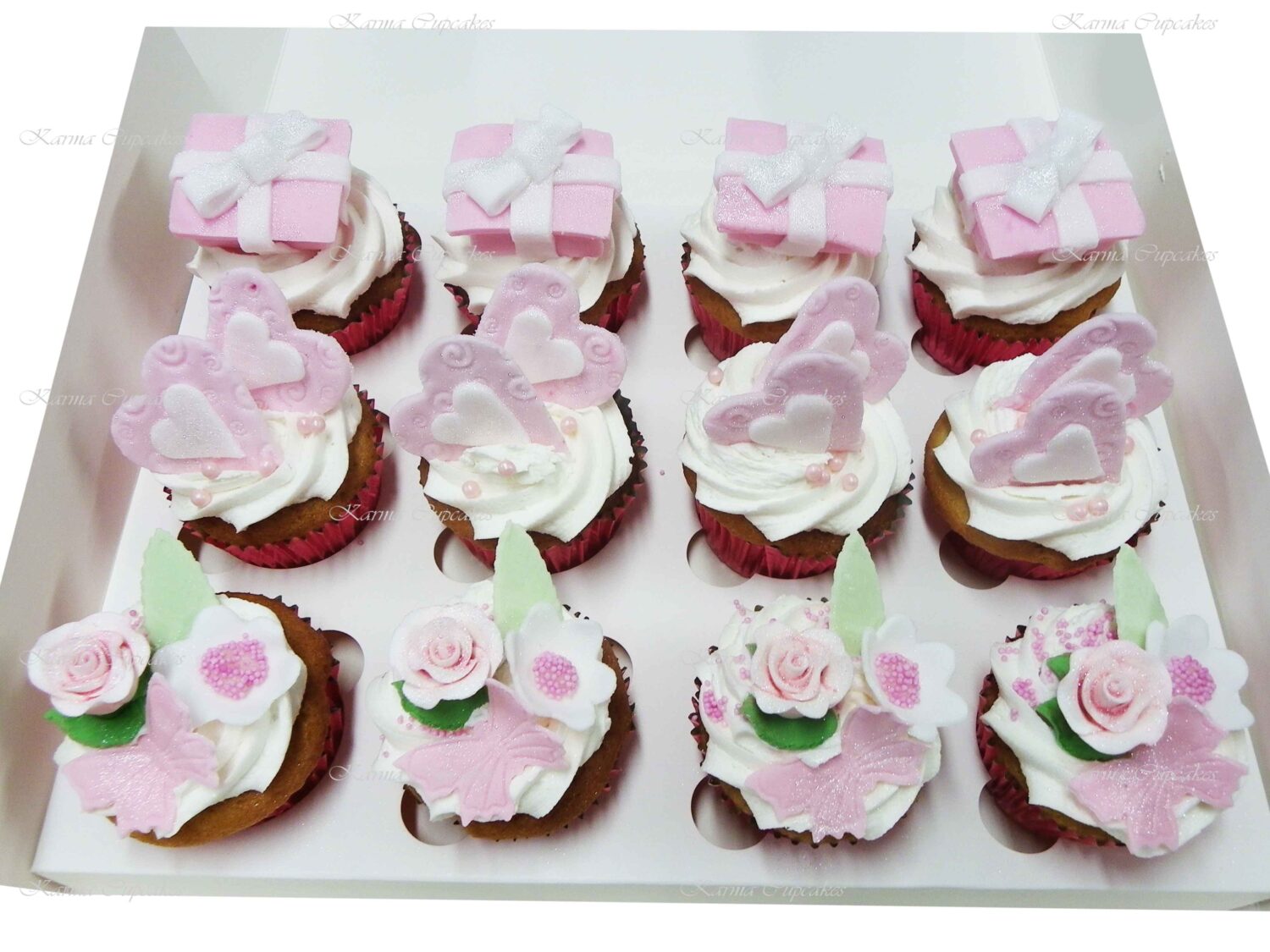 Chocolate and vanilla cupcakes with Edible flowers, hearts and butterflies and handmade 3D presents.