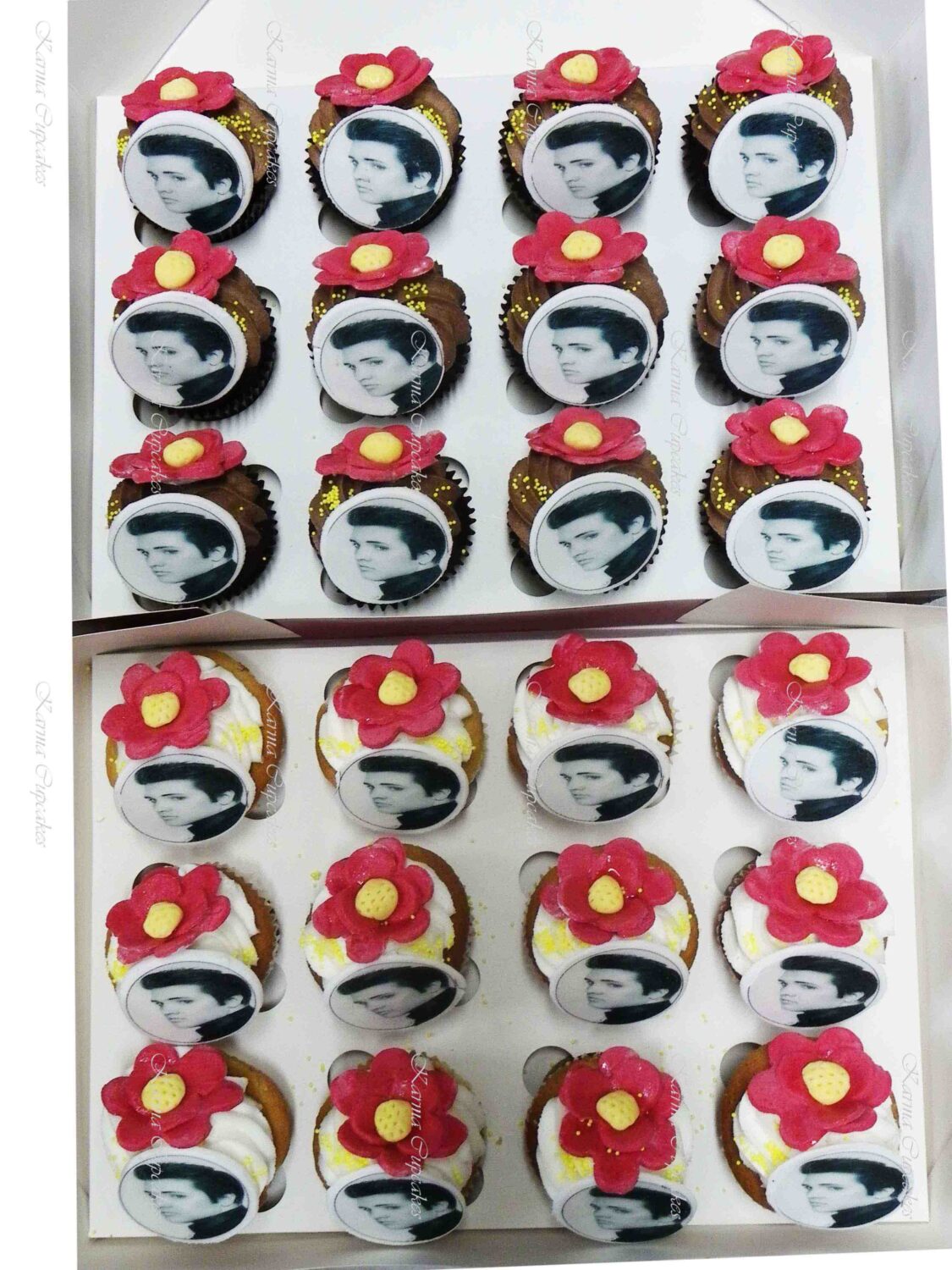 Chocolate and vanilla cupcakes with Edible Photos of Elvis Presley and/or Marilyn Monroe.