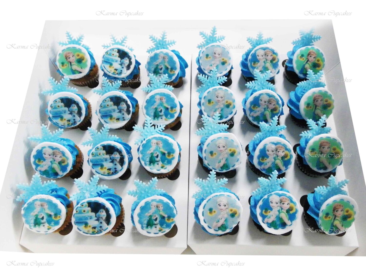 24 Chocolate and vanilla cupcakes with edible images of Frozen Anna & Elsa Characters, with sugar snowflakes and sprinkles.