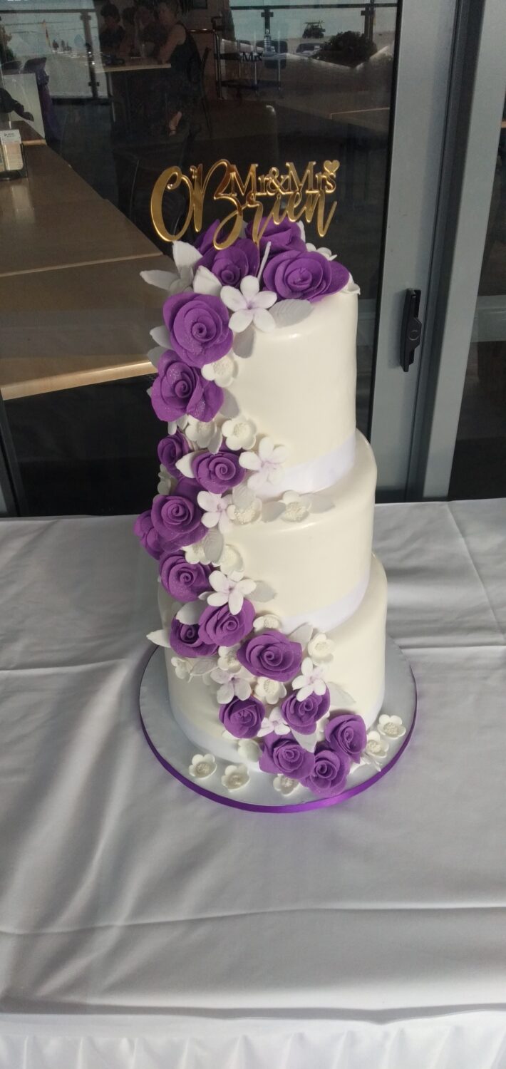 Our high three tiered fondant iced wedding cake is a crowd pleaser, with your choice of flavours for each tier.