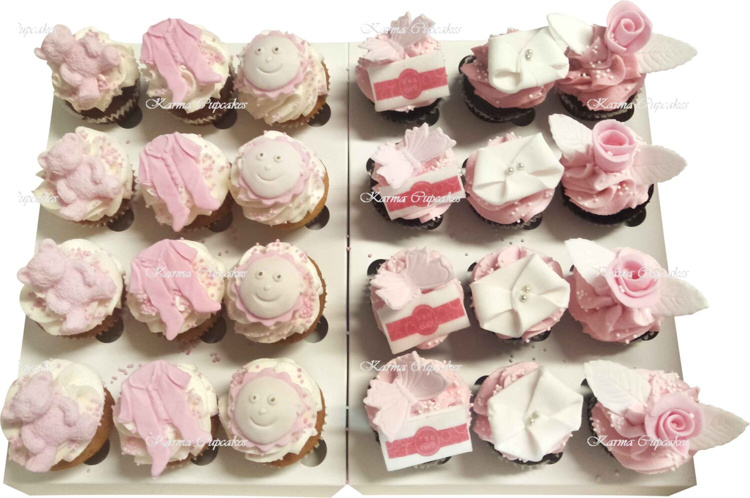 24 mini Vanilla and Chocolate Cupcakes topped with pink icing and decorated with a 3D face, flowers, teddies, butterflies. Also the wording “it’s a girl” or your baby’s name. A great gift for new parents.