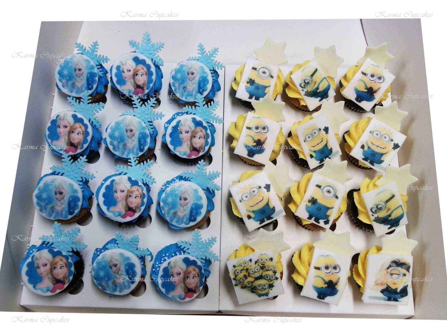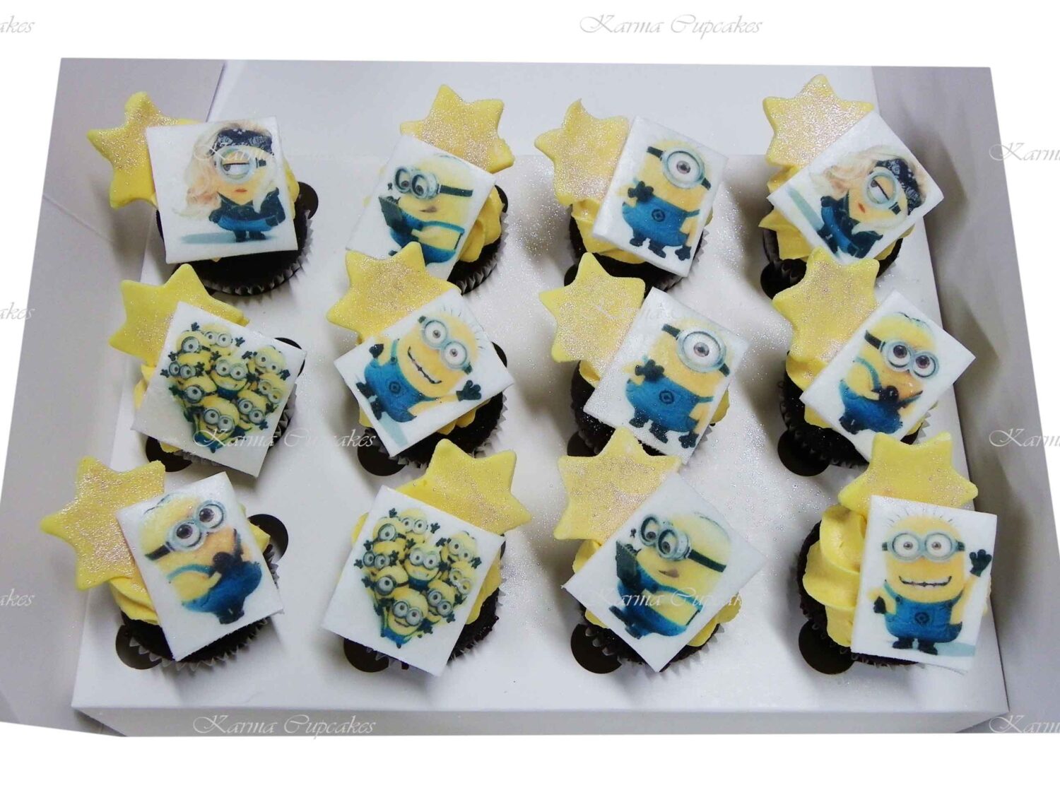 24 Chocolate and vanilla Mini cupcakes with yellow buttercream icing topped with Edible Minions Images and stars