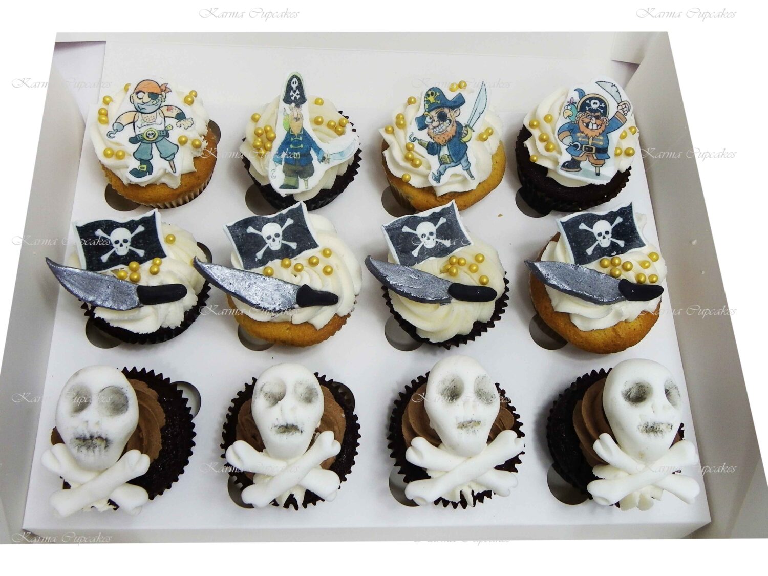Vanilla and chocolate Cupcakes topped with edible images of Pirates, Skulls and Crossbows, Sword and Pirate Flag. If you would like an edible birthday wish plaque, please let us know the recipients name at checkout