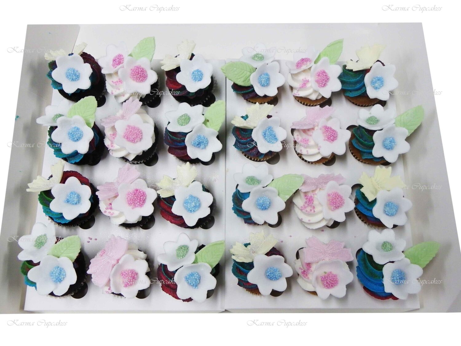 Chocolate and vanilla cupcakes topped with Sugar Flowers and Leaves on rainbow swirled buttercream icing with sprinkles.