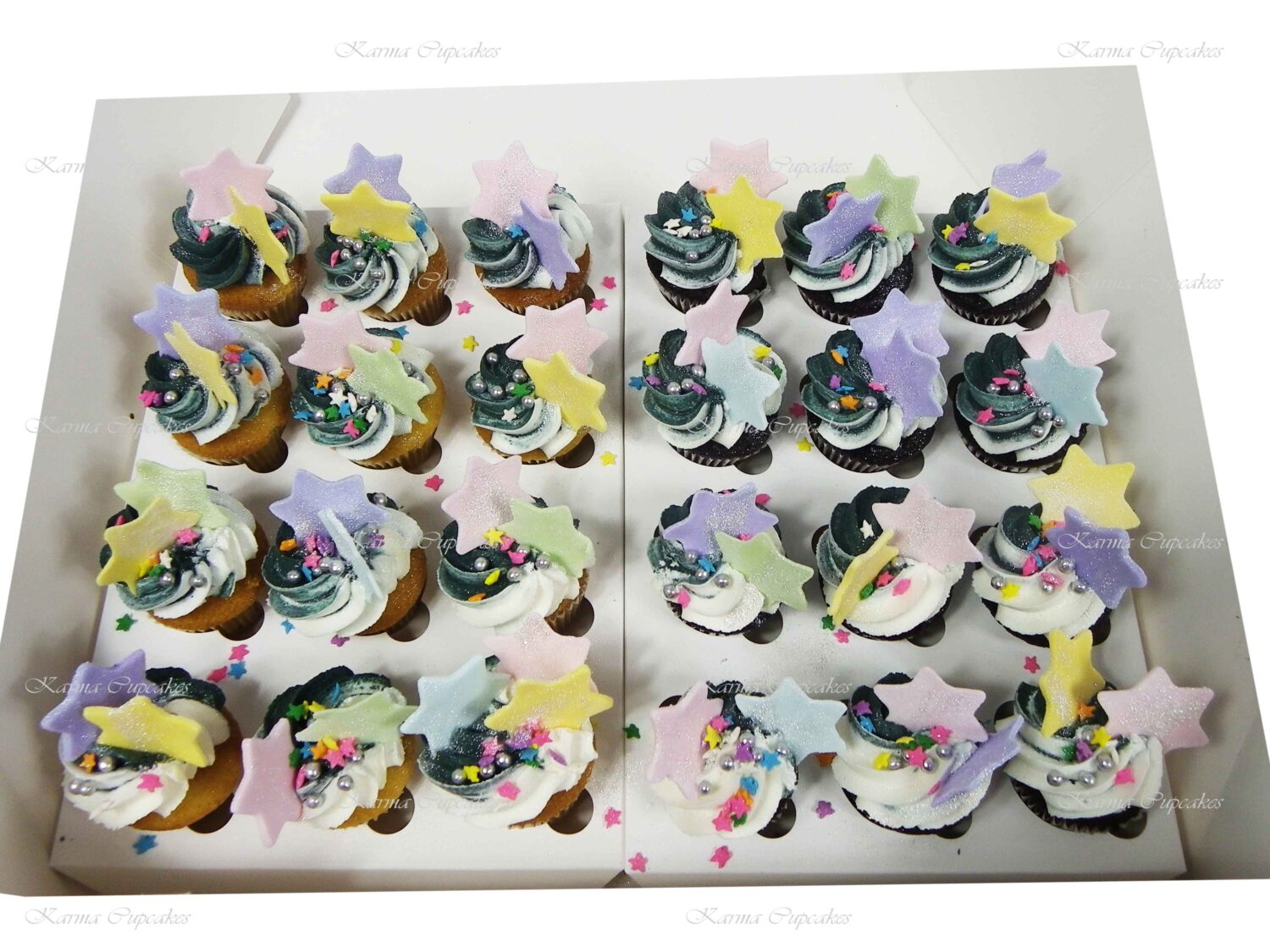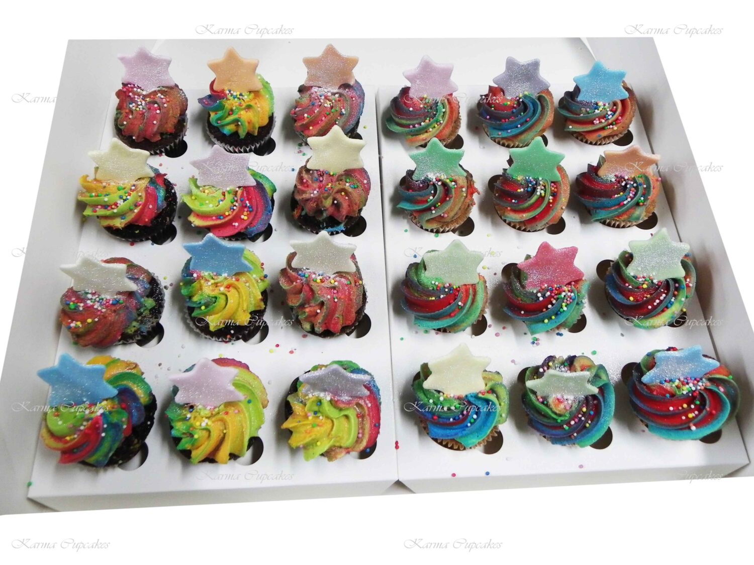Mini vanilla and chocolate cupcakes with rainbow icing, stars and sprinkles.