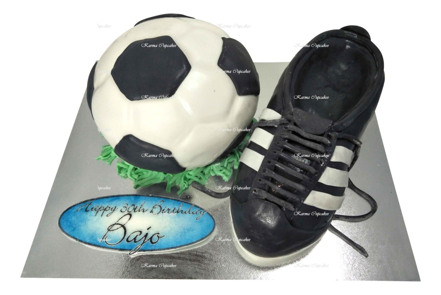 We will require 48-hours’ notice to make this soccer ball and shoe themed cake for you.