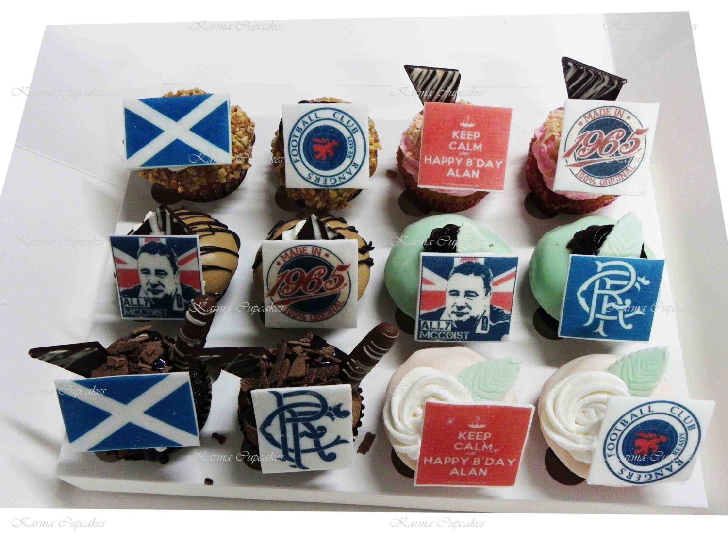 12 of our Gourmet Cupcakes with edible images of your favourite team and handmade sports gear.