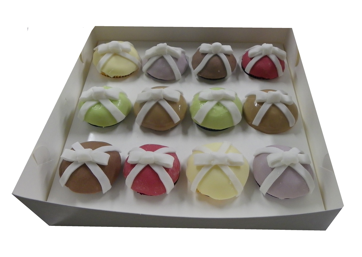 Chocolate and vanilla cupcakes with handmade bows and a light sprinkling of white lustre.