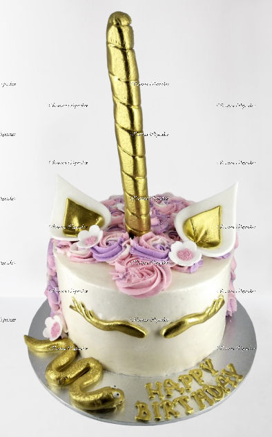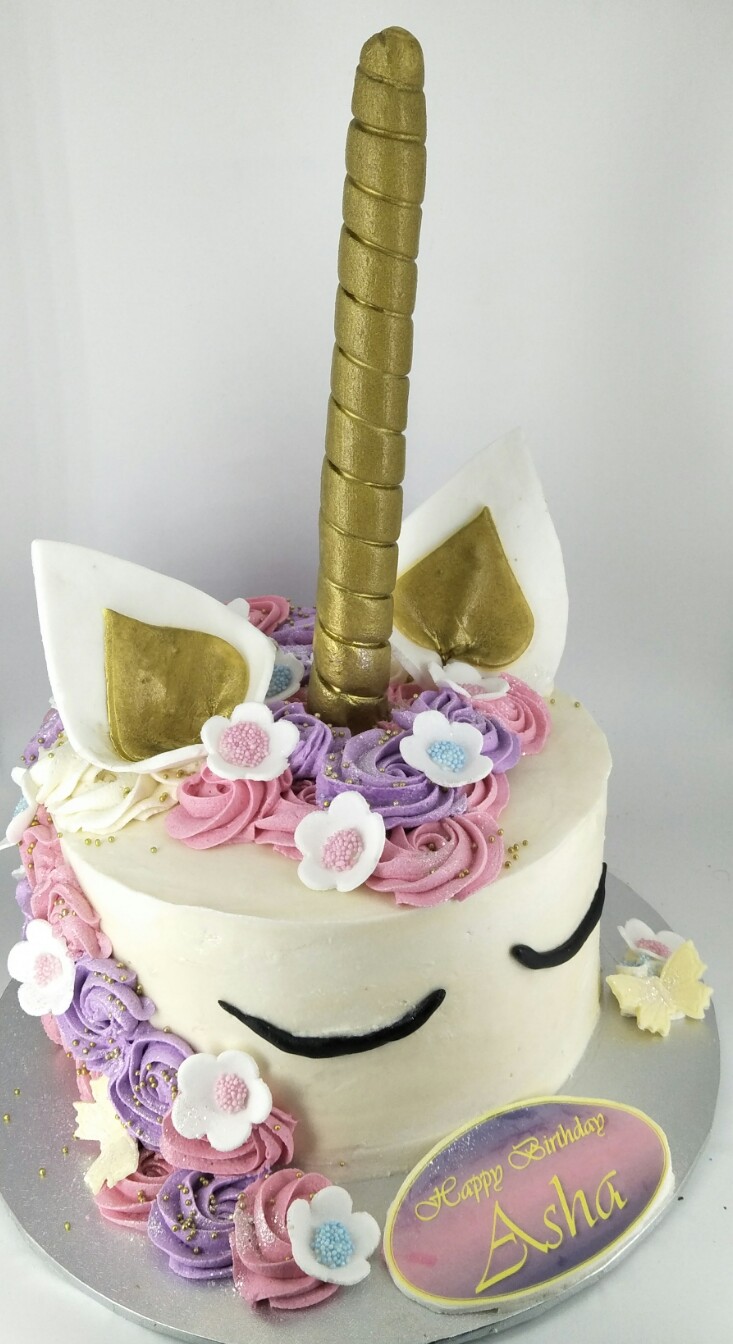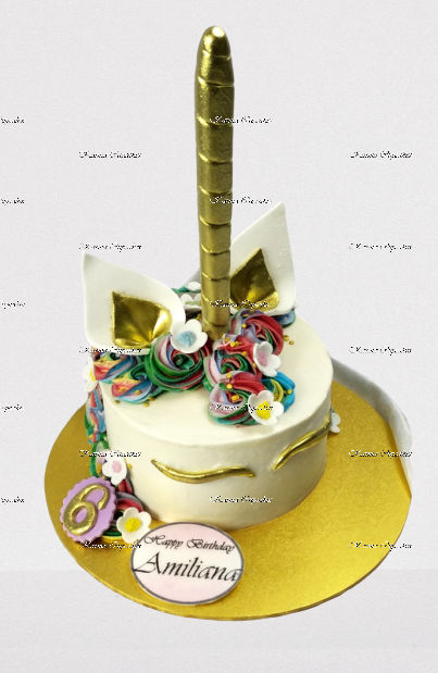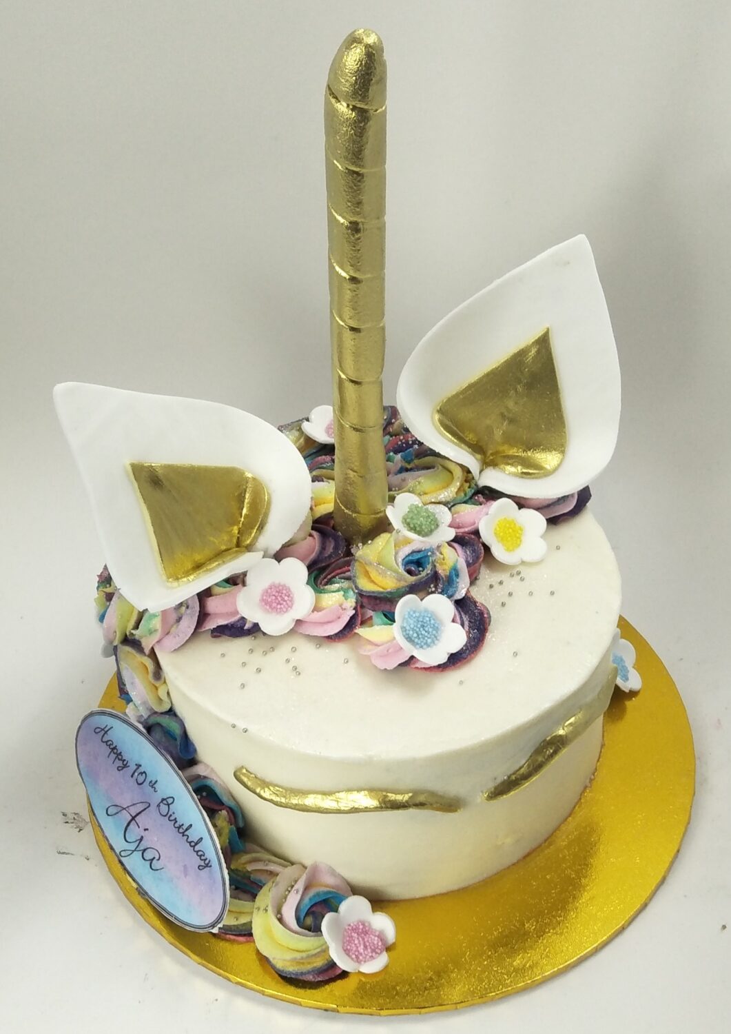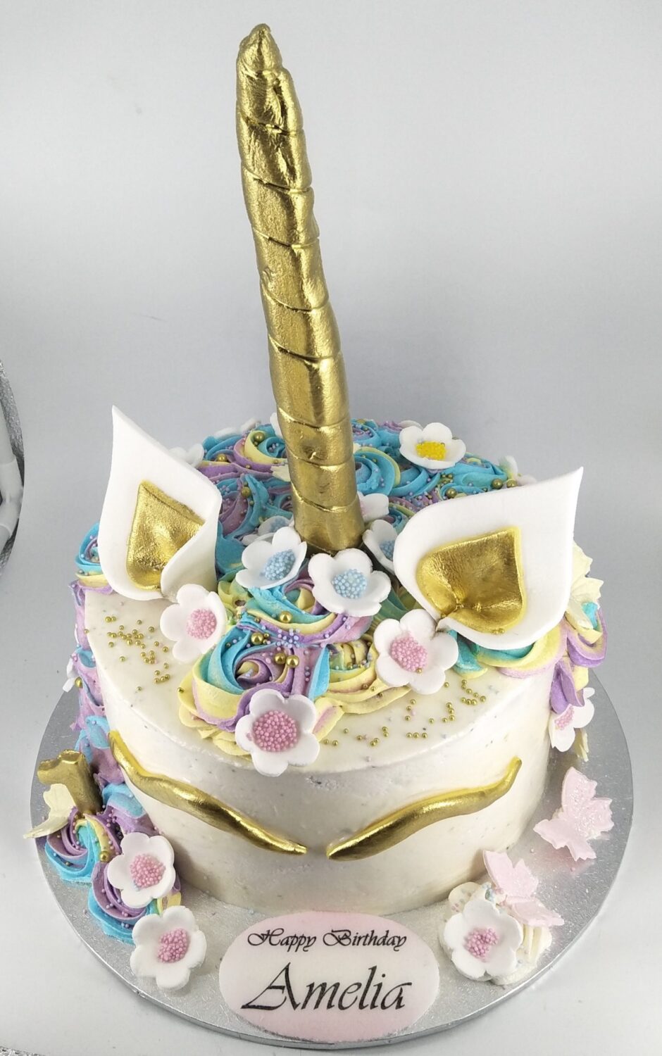 Single tier 8 inch cake with unicorn ears and horn and flowers.