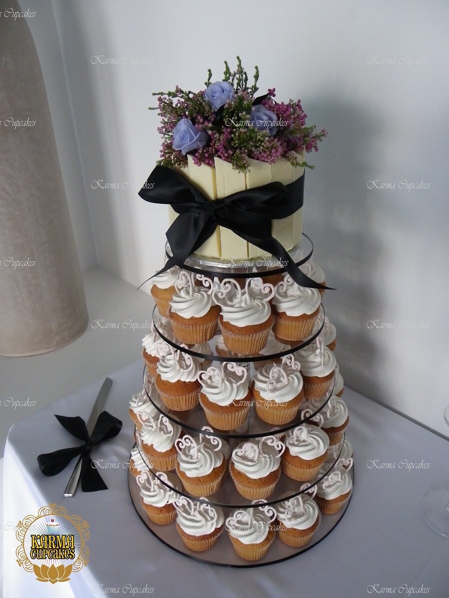 Classic style mini cupcakes accompanied by a double layer white chocolate cake topped with fresh flowers.